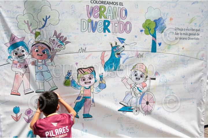 Una manta es pintada por uno de los niños que asistió a Verano Divertido organizado por Pilares.