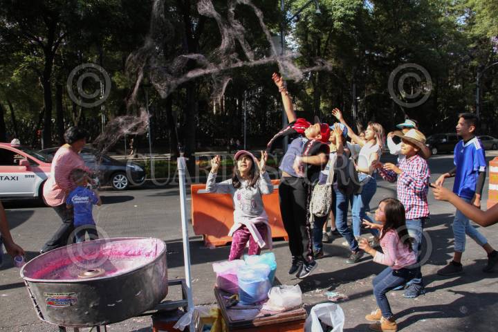 CIUDAD DE MÉXICO, 21ABRIL2019.- Niños intentan agarrar algunos restos de algodón de azúcar que flotan en el aire, sobre Paseo de la Reforma. FOTO: ROGELIO MORALES /CUARTOSCURO.COM