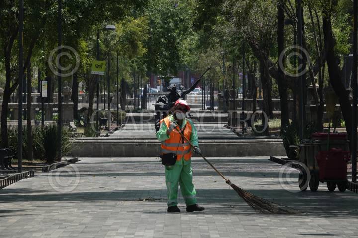 Un mujer de limpieza barre los pasillos de la Alameda Central