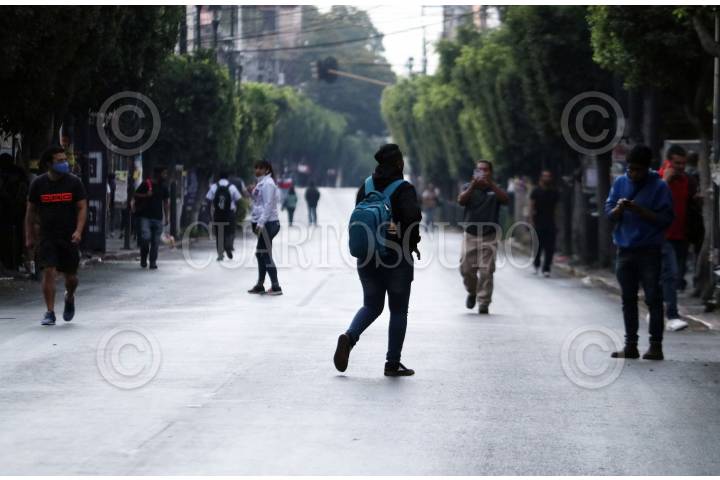 Hombres y mujeres caminan en la avenida Morelos, vacía por bloqueos que mantienen trabajadores del ayuntamiento en el sur y norte de la capital.