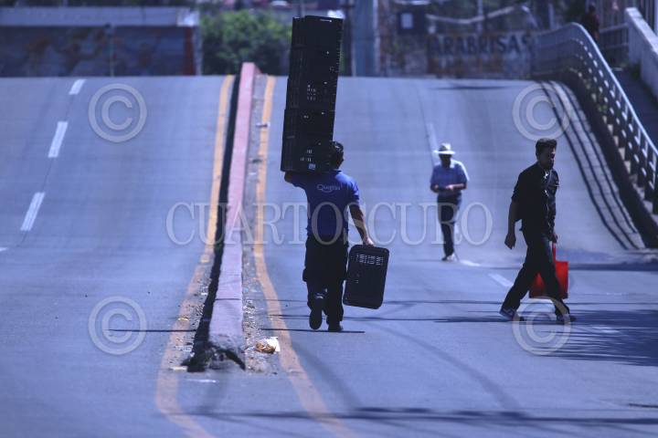 Vida cotidiana en Cuernavaca, tres hombres caminan en la avenida Leandro Valle que luce vacía por un bloqueo de vecinos que piden el servicio de agua potable.