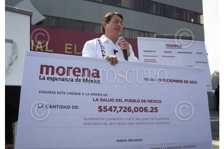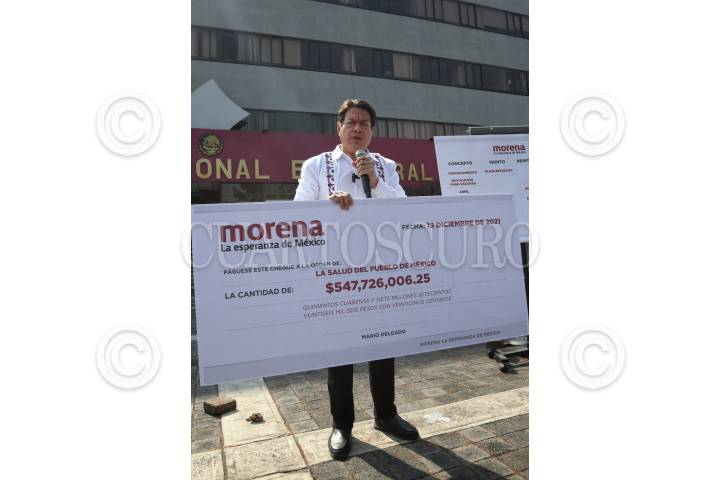 Mario Delgado, presidente del partido político MORENA ofreció conferencia se prensa luego de entregar un cheque de $547, 726, 006.25 en el Ine supuestamente para vacunas contra COVID-19.