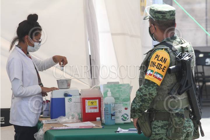 Personal médico supervisado por elemento del ejército durante vacunación.