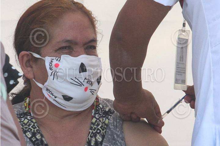 Mujer adulto mayor, durante la aplicación de la vacuna contra COVID-19 en el Bosque de Tláhuac.