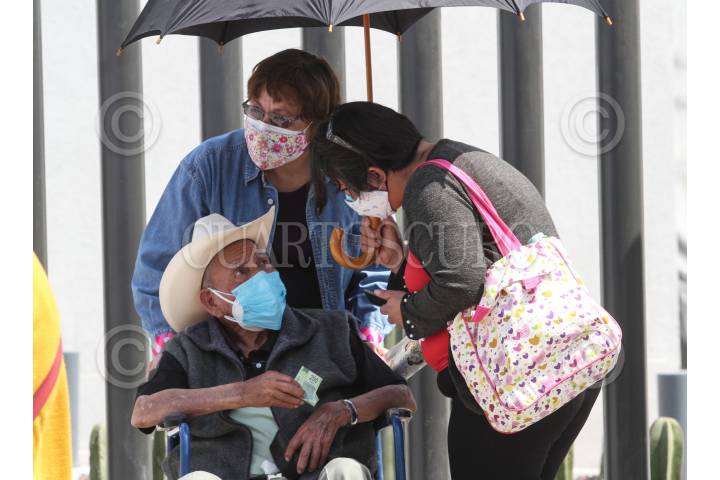Salida de mujer adulto mayor, protegida por familiares de los rayos del sol.