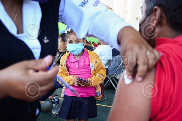 Bajo la lluvia, jóvenes y persona rezagadas abarrotan el Deportivo Xochimilco para la vacunación contra COVID-19.