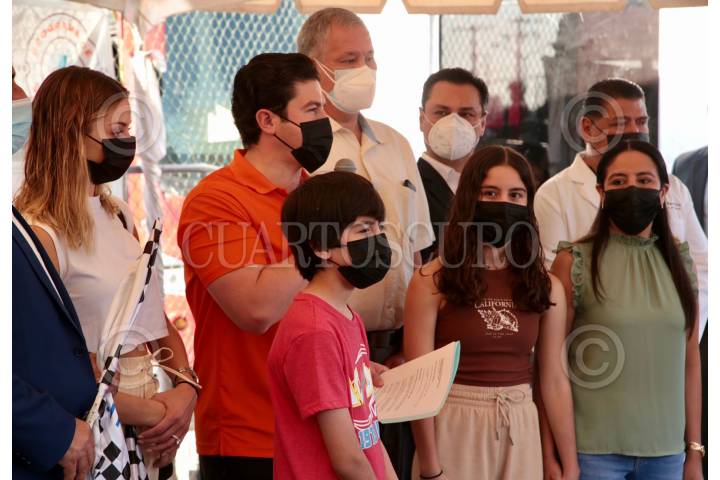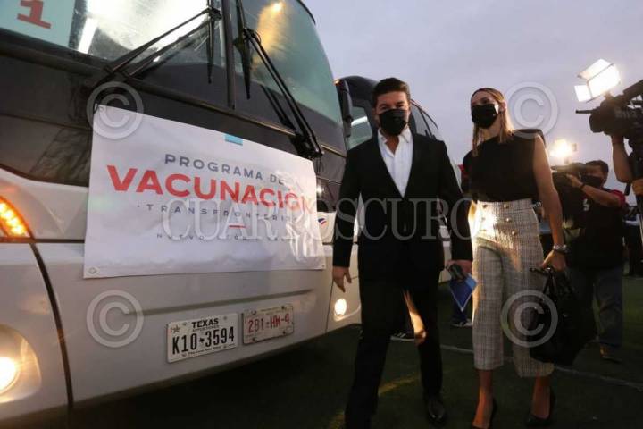 El gobernador Samuel García y su esposa Mariana Rodríguez Cantú dieron el banderazo a 18 camiones que trasladaron a 500 niños para que fueran vacunados contra el Covid-19 en los tres puentes fronterizos que colindantes con Estados Unidos.