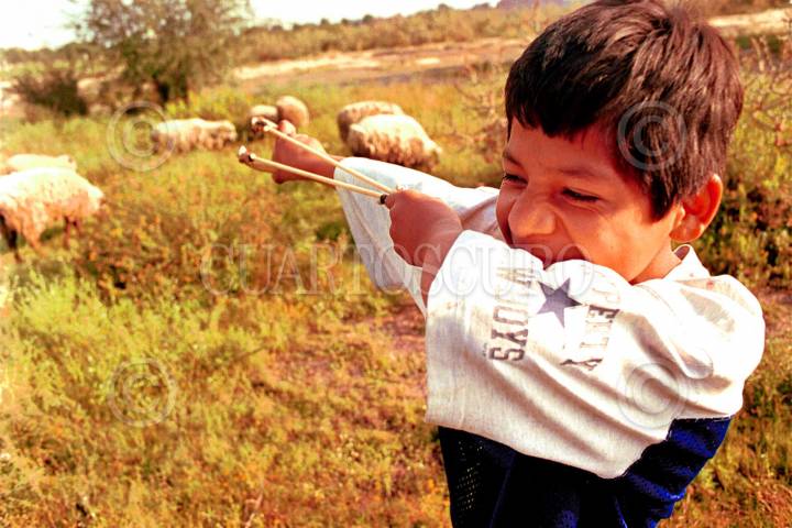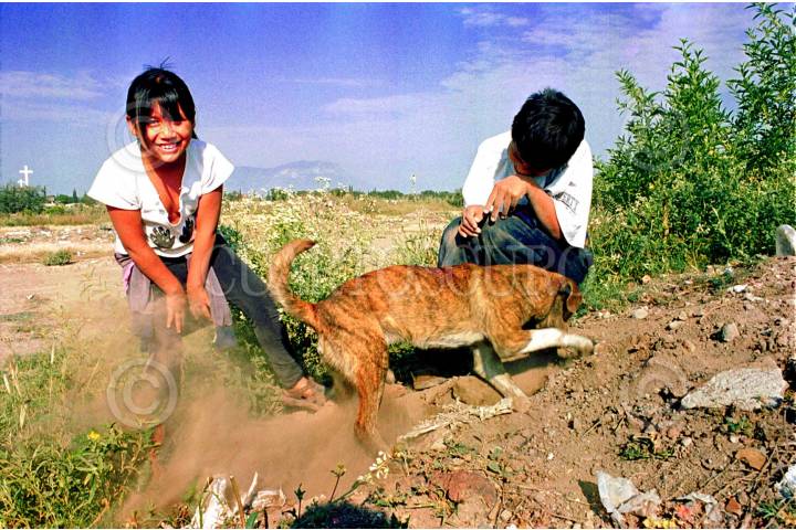 Mientras partorean sus borregos, Flor y Sebastián juegan con "el pinto" en hoyos de tierra, donde eventualmente encuentran conejos y liebres; animales que llevan a su casa para comerlos. FOTO: Juan Pablo Zamora/CUARTOSCURO.COM