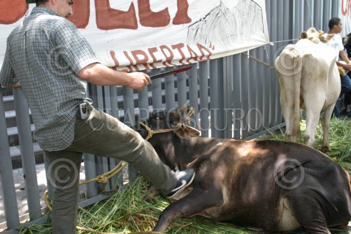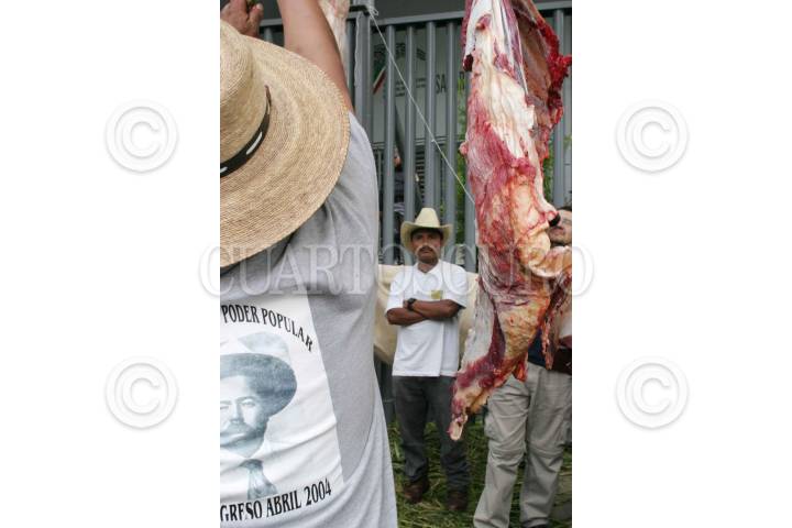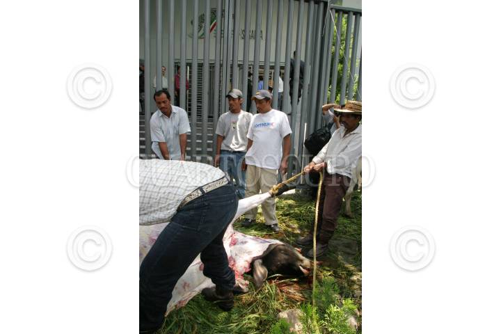 Mexico, D.F., 21JULIO2004.- Integrantes del Frente Popular Francisco Villa, sacrificaron a una res enfrente de la SAGARPA, en protesta a incumplimiento del proyecto denominado Adquisicion de Ganado de Bovino de Doble Proposito, firmado entre autoridades de la Sagarpa y el FPFV. FOTO: Moises Pablo/CUARTOSCURO.COM
