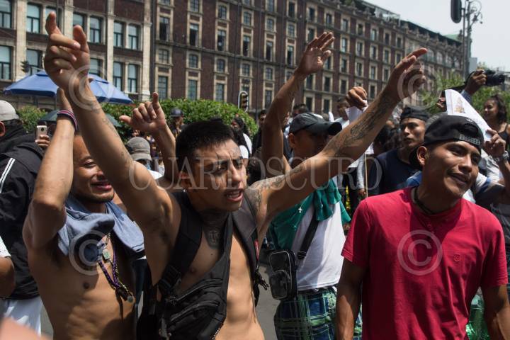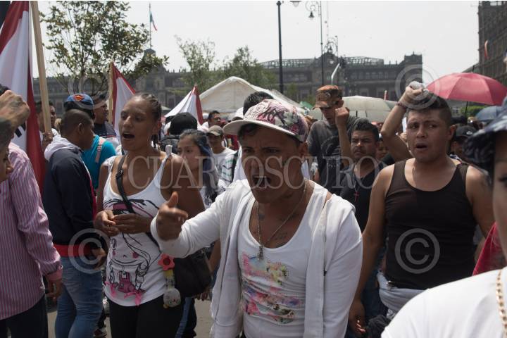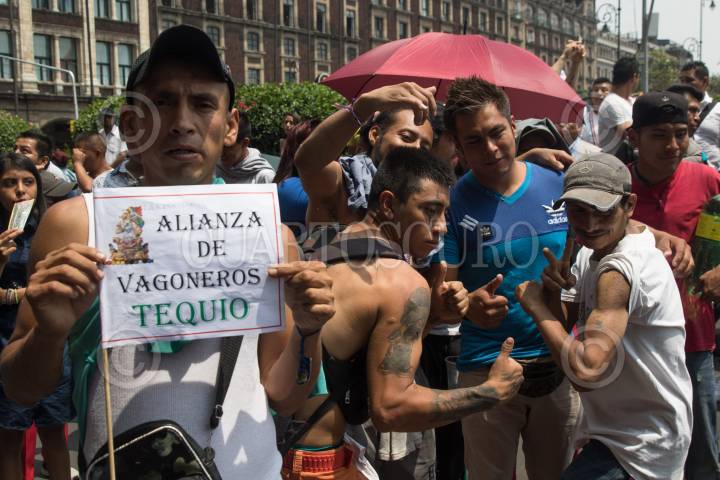 CIUDAD DE MÉXICO, 29MAYO2019.- Vagoneros del metro se manifestaron en el Zócalo capitalino para exigir lo que ellos llaman su "derecho" de poder trabajar en las instalaciones de este sistema de transporte, le pidieron a la Jefa de Gobierno su intervención para que paren los operativos en su contra. FOTO: MOISÉS PABLO /CUARTOSCURO.COM
