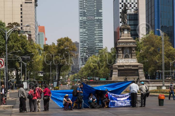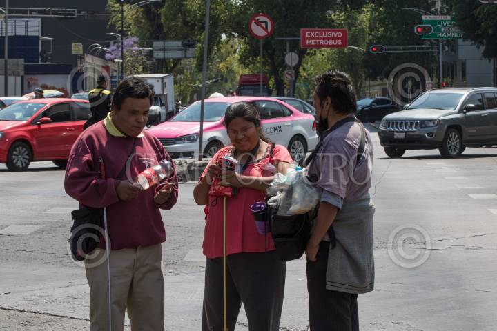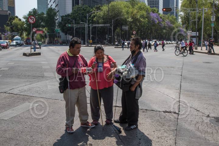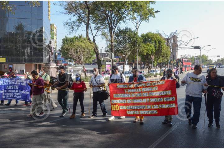 Débiles visuales que se dedican a vender o cantar en el metro bloquearon avenida Reforma para exigir al gobierno capitalino que lo dejen trabajar libremente en este transporte, ya que denuncian que la policía los hostiga constantemente.
