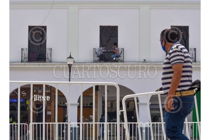 Una pareja disfruta de una terraza, algunos espacios continúan cerrados a pesar de que la entidad mexiquense se encuentra en semáforo epidemiológico color verde.
