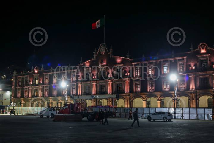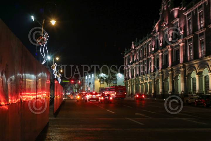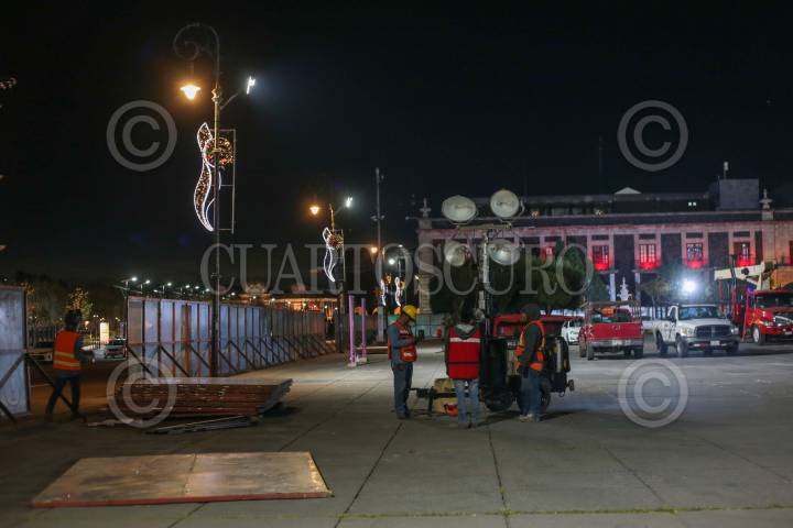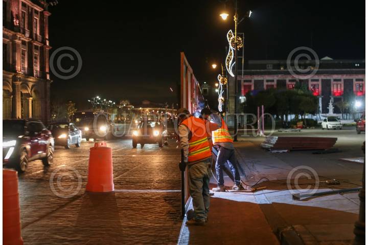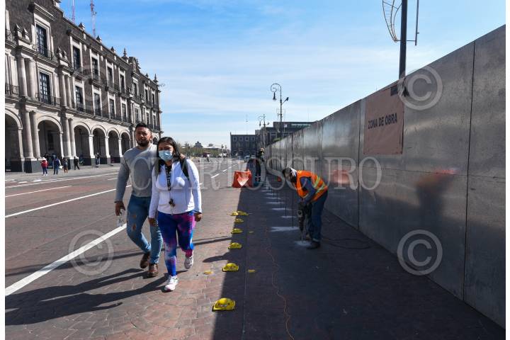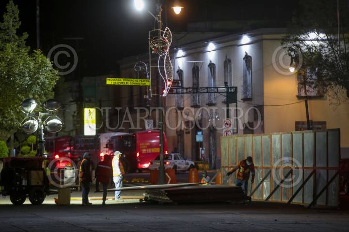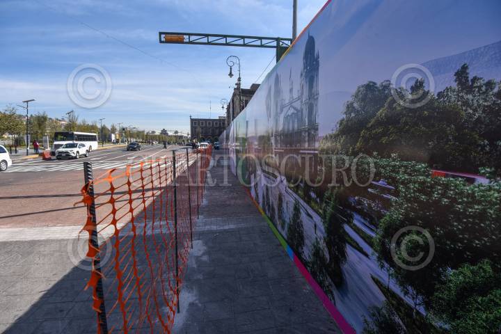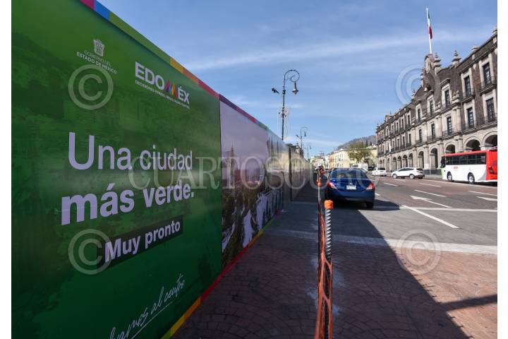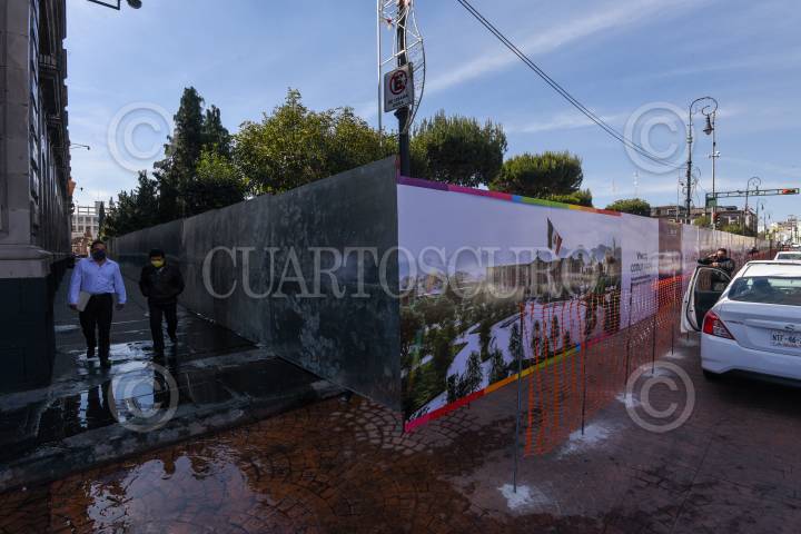 Vallas metálicas cerca la Plaza de los Mártires en Toluca para dar inicio a la obra de remodelación de este espacio público en la capital mexiquense, el cual tendrá más zonas verdes.