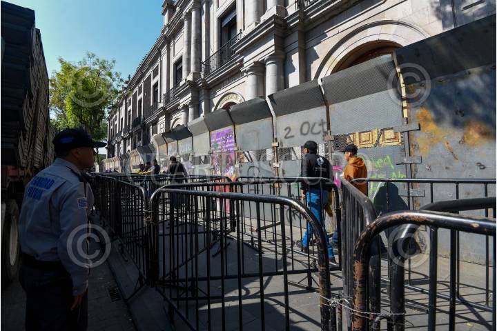 TOLUCA, ESTADO DE MÉXICO, 06MARZO2025.- Previo a las marchas del 8M ya se inició con la colocación de vallas metálicas en los edificios de Palacio de Gobierno, la Cámara de Diputados local y el Poder Judicial, los ciudadanos tienen caminar por abajo de las banquetas por los obstáculos que representan estas vallas y arriesgando su integridad. FOTO: CRISANTA ESPINOSA AGUILAR /CUARTOSCURO.COM