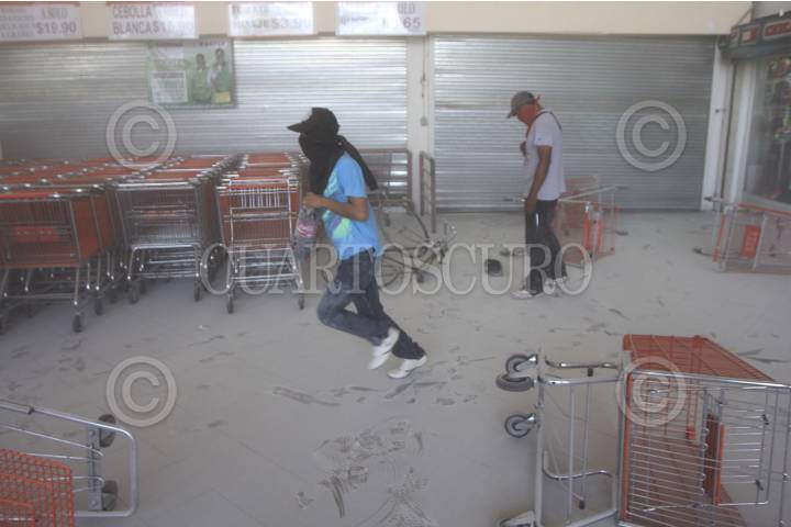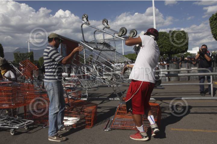 OAXACA, OAXACA, 19MARZO2014.- Jóvenes pertenecientes a la Coordinadora Estudiantil Normalista del Estado de Oaxaca (CENEO) mantienen cerradas las instalaciones del centro comercial Plaza Oaxaca, donde se encuentran retenidas un número indeterminado de personas entre compradores y vendedores. Al lugar arribaron elementos de la policía estatal, sin embargo hasta el momento no se han enfrentado, los estudiantes cuentan con bombas molotov y bazucas caseras, los policías con equipo anti motín. FOTO: ARTURO PÉREZ ALFONSO /CUARTOSCURO.COM