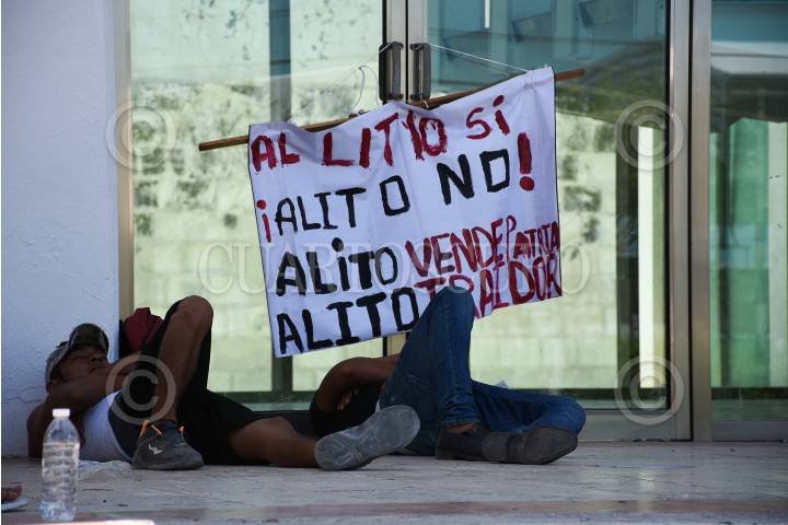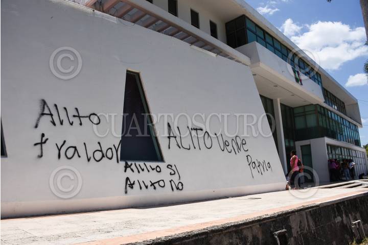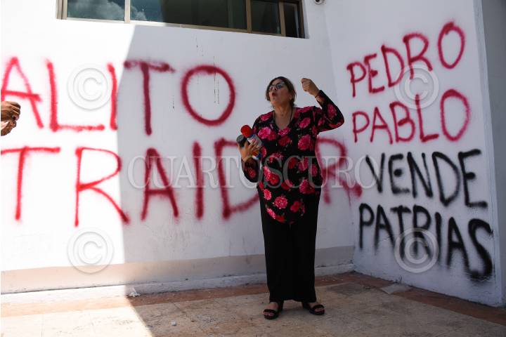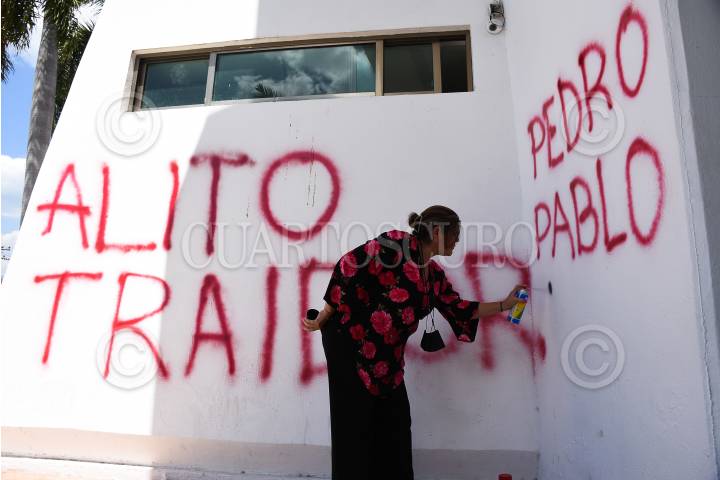 La diputada local morenista Elisa Hernández vandalizó las oficinas estatales del PRI con las consignas de Alito traidor y Pedro Pablo vende patrias.