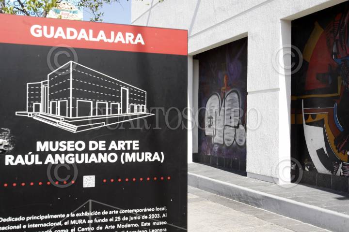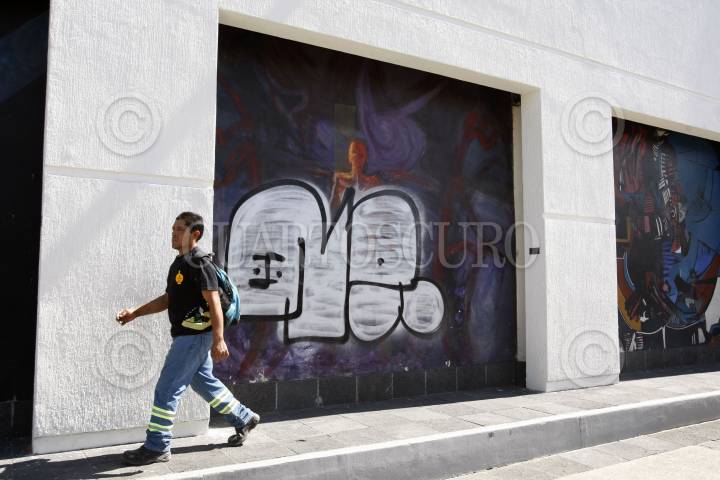 GUADALAJARA, JALISCO. 30MARZO2016.- Fue vandalizado por vagos, el mural del artista Gustavo Aranguren que se encuentra en la fachada principal del Museo de Arte Raúl Anguiano (MURA) el cual se realizo en 1990 como parte de la colección de 16 murales efímeros que se encuentran en el perímetro del museo, misma conforma una muestra de diversas tendencias de arte y que tienen origen en una primera muestra de 1971 para el Centro de Arte Moderno que se encontraba anteriormente en el recinto que hoy ocupa el MURA. FOTO : FERNANDO CARRANZA GARCIA / CUARTOSCURO.COM