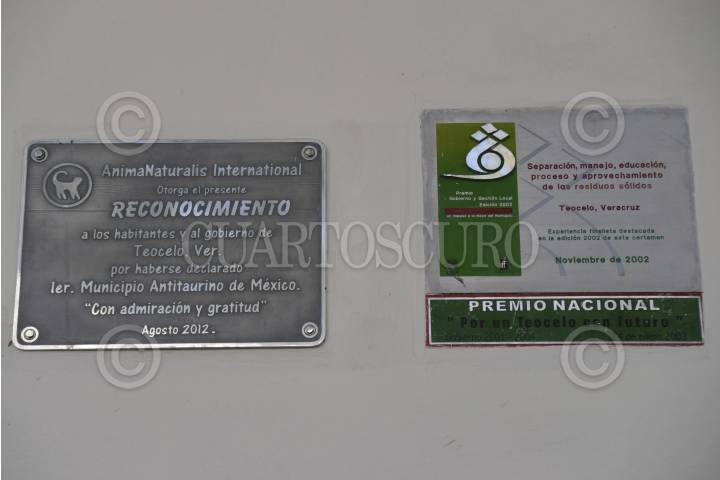 TEOCELO, VERACRUZ, 27ENERO2014.- Sin contar con autorización del municipio, se encuentra colocado un reconocimiento de la asociación protectora de animales Anima Naturalis Internacional en la puerta principal del ayuntamiento por haber sido declarado el primer municipio antitaurino del país desde agosto pasado. Por segundo año consecutivo, vecinos de la calle principal Rubén Darío, improvisaron vallas con cuerdas, estructuras metálicas y madera para resguardarlo en el marco de una de las tradiciones más arraigadas del municipio, la “vaquillada”. La administración actual presidida por Ana Lilia López Vanda del PRI, aseguró que dicha actividad será calificada por la población mediante una encuesta y será clausurada hasta que no se cuenten con los resultados de l cuestionario. FOTO: RUBÉN ESPINOSA /CUARTOSCURO.COM