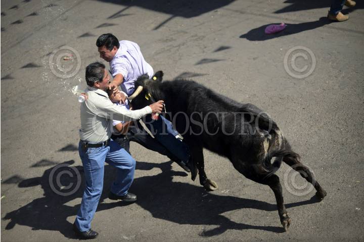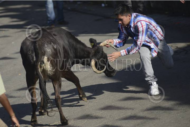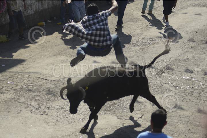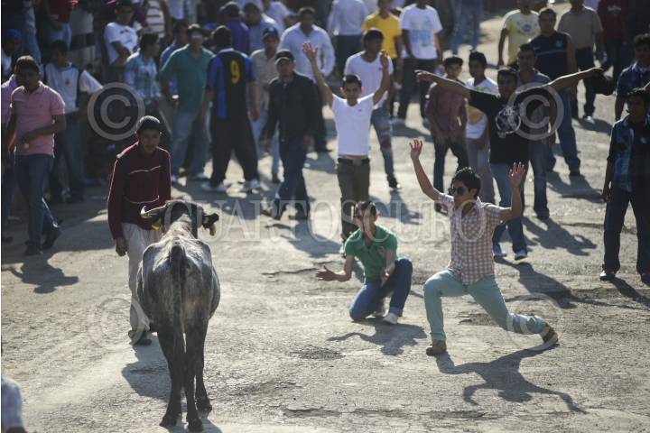 TEOCELO, VERACRUZ., 28ENERO2013.- Habitantes del municipio de Teocelo improvisaron una “vaquillada” en la calle Rubén Darío, pese a que las autoridades han declarado al municipio como antitaurino, siendo el primero en el estado de Veracruz. Cabe resaltar que los vecinos anticipaban mediante cartulinas que no se harían responsables de la integridad física de las personas que asistieran al evento. FOTO: TONA NAVARRO /CUARTOSCURO.COM