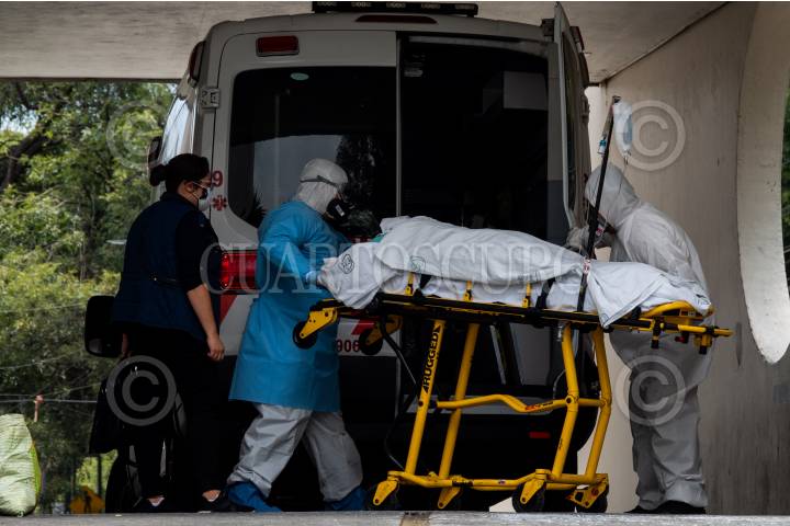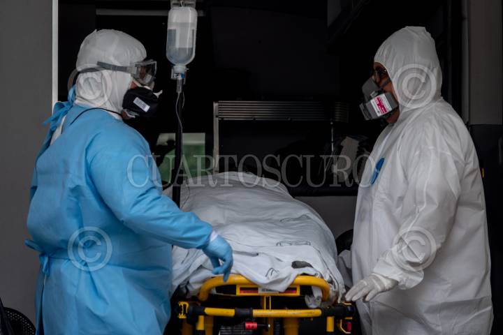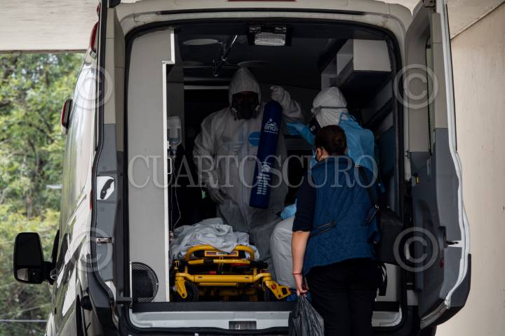 Enfermeros realizan un traslado de un paciente que estaba internado en la unidad Covid-19 del Hospital Venados en la alcaldía Benito Juárez.