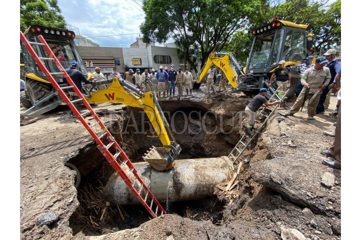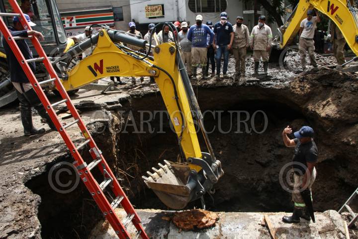 Trabajos en socavón y tubería luego de fuga de agua potable.
