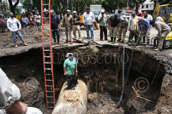Trabajadores de la alcaldía coyoacan realizan labores reparación en tubería afectada.