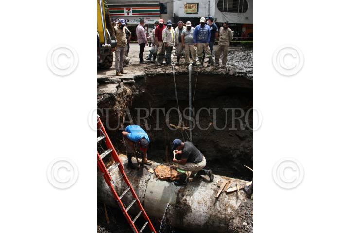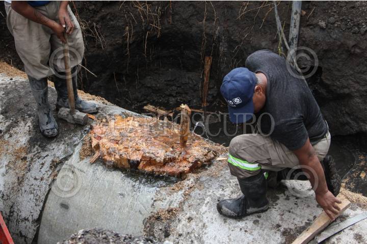 Trabajadores de gobierno durante reparación de tubería de agua potable.