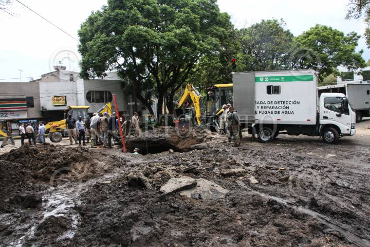 Trabajadores de la alcaldía coyoacan realizan labores de reconocimiento en socavón creado por fuga de agua.