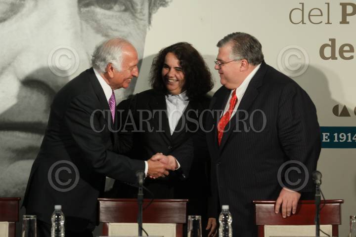 MÉXICO, D.F., 31MARZO2011.- Marcelo de los Santos Fraga, director general de la Casa de Moneda, Consuelo Sáizar, presidenta del CONACULTA y Agustín Carstens Carstens, gobernador del Banco de México, durante la presentación de la moneda de veinte pesos que conmemora su valor en años la entrega del Premio Nobel de la Paz a el escritor Octavio Paz (1914-1998), en una ceremonia realizada en la sede central del Banco de México. FOTO: MOISÉS PABLO/CUARTOSCURO.COM