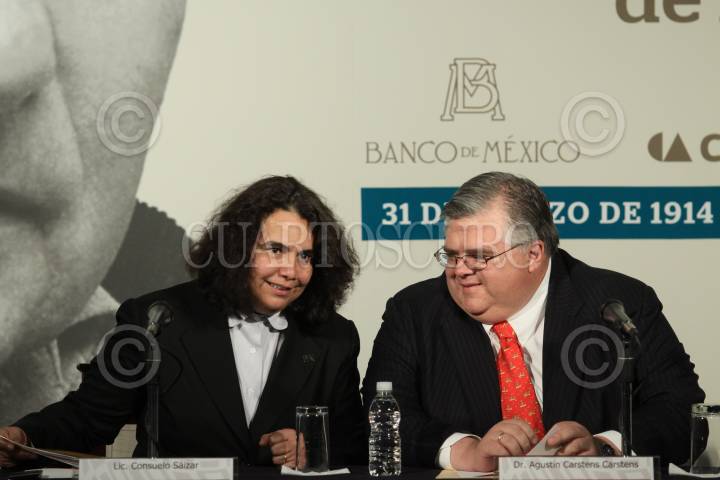 MÉXICO, D.F., 31MARZO2011.- Agustín Carstens Carstens, gobernador del Banco de México y Consuelo Sáizar, presidenta del CONACULTA, durante la presentación de la moneda de veinte pesos que conmemora su valor en años la entrega del Premio Nobel de la Paz a el escritor Octavio Paz (1914-1998), en una ceremonia realizada en la sede central del Banco de México. FOTO: MOISÉS PABLO/CUARTOSCURO.COM