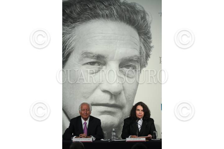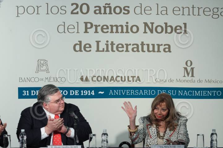 MÉXICO, D.F., 31MARZO2011.- Marcelo de los Santos Fraga, director general de la Casa de Moneda y Consuelo Sáizar, presidenta del Consejo Nacional para la Cultura y las Artes (CONACULTA), durante la presentación de la moneda de veinte pesos que conmemora su valor en años la entrega del Premio Nobel de la Paz a Octavio Paz (1914-1998), la ceremonia se realizó en la sede central del Banco de México. FOTO: MOISÉS PABLO/CUARTOSCURO.COM