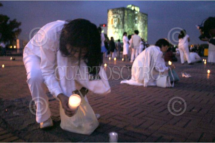 México, D. F. 05 FEBRERO 2004.- Para recordar a las muertas de Ciudad Juárez se realizó un acto en la explanada de rectoría, en la que estudiantes y miembros del STUNAM participaron colocando una veladora por cada una de las mujeres asesinadas en Ciudad Juárez Chihuahua. FOTO: Iván Stephens/CUARTOSCURO.COM
