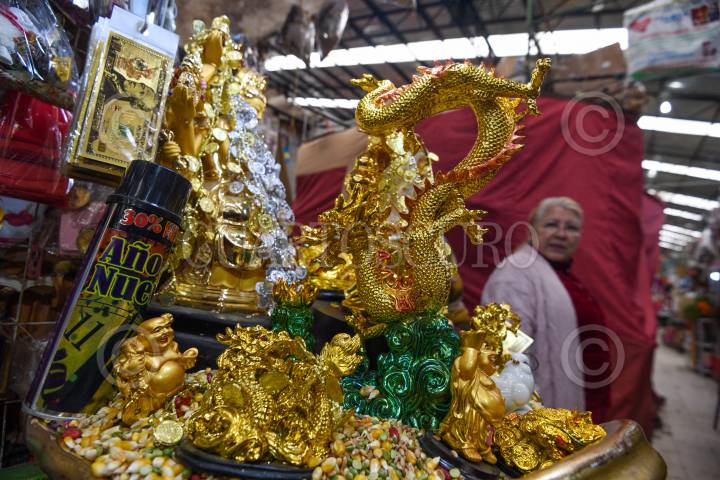 TOLUCA, ESTADO DE MÉXICO, 29DICIEMBRE2023.- Dentro de la tradición para recibir el Año Nuevo muchas personas realizan diversos rituales y acuden a comprar borregos de la suerte, amuletos para atraer dinero, salud, amor, velas preparadas para la abundancia, manzanas, cuarzos, este año en el Año Nuevo Chino será del dragón y ya se pueden encontrar de diversos materiales y tamaños; en el mercado 16 de septiembre en Toluca se pueden encontrar todos estos rituales y la gente acude con Antonia Terrón mejor conocida como Toñita quien ya tiene muchos años dedicándose a la venta de todos estos rituales, la buscan de todos lados y todo el año. FOTO: CRISANTA ESPINOSA AGUILAR /CUARTOSCURO.COM