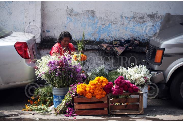 Una mujer vende flor de cempaxúchitl, terciopelo y otras flores en un espacio que dejan dos vehículos estacionados fuera del panteón de La Leona.