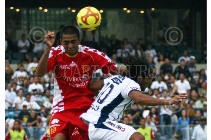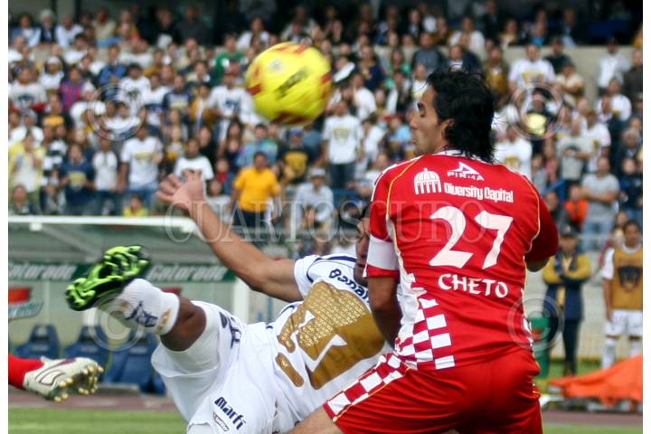 MÉXICO, D.F., 16MAYO2009.- Diego Jimenez de los Tecos de la AUG busca el balón durante el encuentro en contra de los pumas de la UNAM en partido de cuartos de final del Clausura 2009 del futbol mexicano; venciendo los Pumas 3 goles a 0 y pasando estos a las semifinales. FOTO: LUZ ACEVEDO/CUARTOSCURO.COM