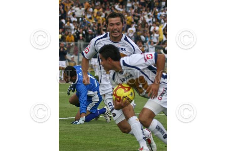 MÉXICO, D.F., 16MAYO2009.- Jugadores de los pumas de la UNAM festejan la tercera anotación en contra de los Tecos de la UAG en partido de cuartos de final del Clausura 2009 del futbol mexicano; venciendo los Pumas 3 goles a 0 y pasando estos a las semifinales. FOTO: LUZ ACEVEDO/CUARTOSCURO.COM