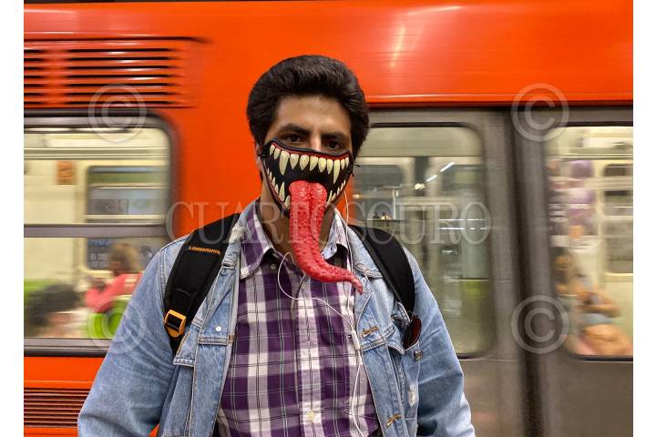 Un joven se protege del COVID-19 en las instalaciones del metro, utilizando un cubrebocas alusivo al personaje de historietas Venom.