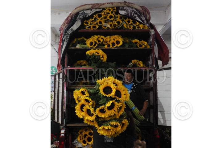 Un hombre carga girasoles en el Mercado Jamaica.