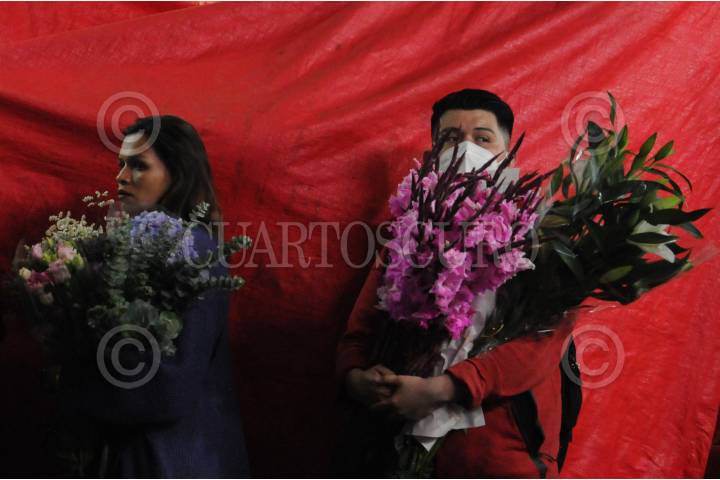 Con arreglo en los brazos, una pareja continúa buscando flores para obsequiar en el Día de las Madres.