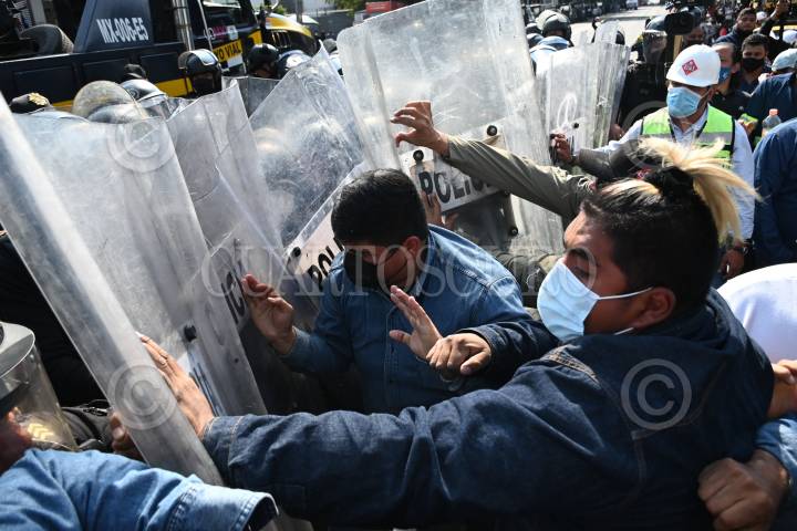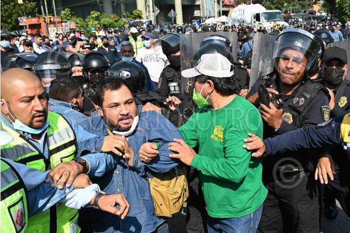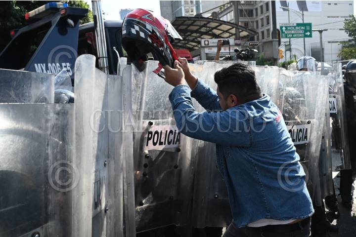Un trabajador de venta de gas golpea con un caso uno de los escudos de los granaderos durante la manifestación.