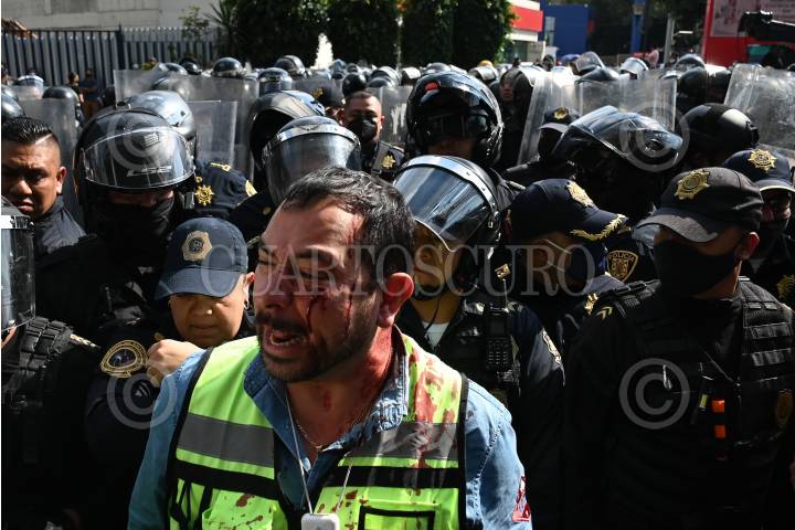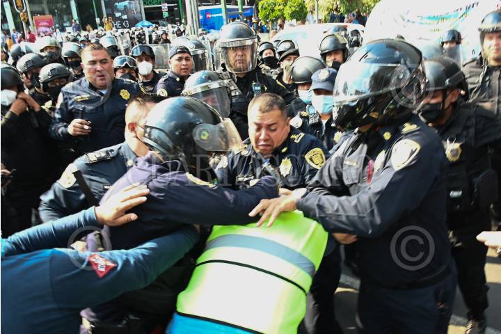 Elementos de la policía someten y golpean a uno de los manifestantes.