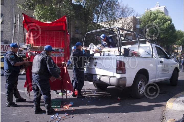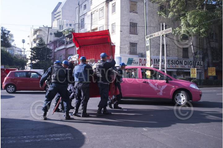 MÉXICO, D.F., 12FEBRERO2014.- Elementos de la policía del Distrito Federal, como parte del Operativo de Recuperación de Espacio Públicos, retiraron algunos de los puestos de vendedores ambulantes afuera del la estación del metro Chilpancingo de la línea 9 del Sistema de Transporte Colectivo. FOTO: MITZI BLANQUET /CUARTOSCURO.COM