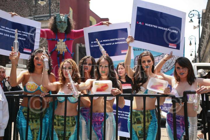 MÉXICO D.F., 31MARZO2009.- Activistas del grupo "WILDCOAST/COSTASALVAJE" vestidas de sirenas se manifestaron a las afueras del senado, para pedir a las autoridades correspondientes, tomen acciones para proteger mas especies de tiburones, ya que según ellos las flotas de barcos atuneros arrasan con la vida marina. FOTO: CUARTOSCURO.COM