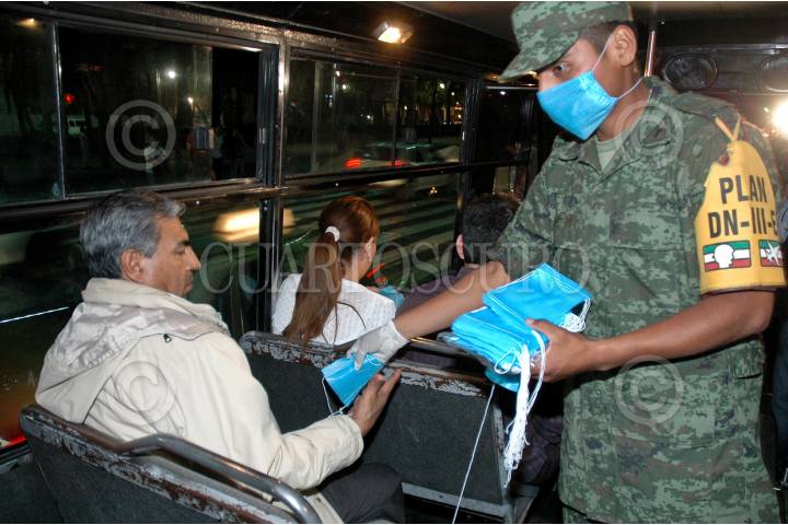 MÉXICO D.F., 24ABRIL2009.- Elementos del ejercito mexicano del Plan DN - III regalan cubrebocas a los usuarios que viajan en los microbuses en Paseo de la Reforma para evitar propagar la epidemia de influenza. FOTO: RODOLFO ANGULO/CUARTOSCURO.COM