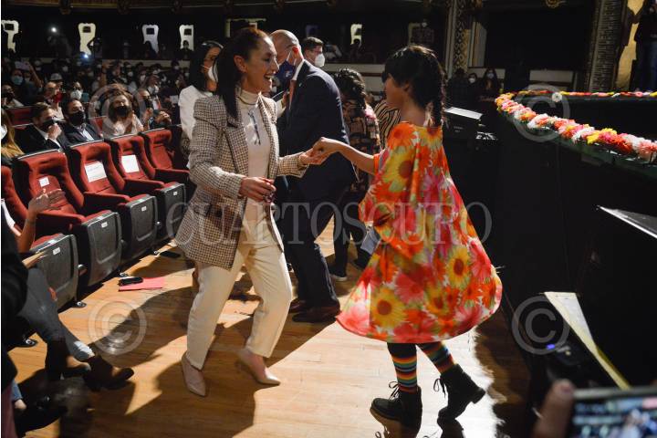 Claudia Sheinbaum, jefa de Gobierno, asistió a la presentación de la puesta en escena "Los jóvenes viajan en el metro" como parte del "Festival Barrio Adentro" celebrado en el Teatro de la Ciudad Esperanza Iris.