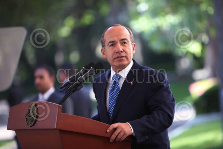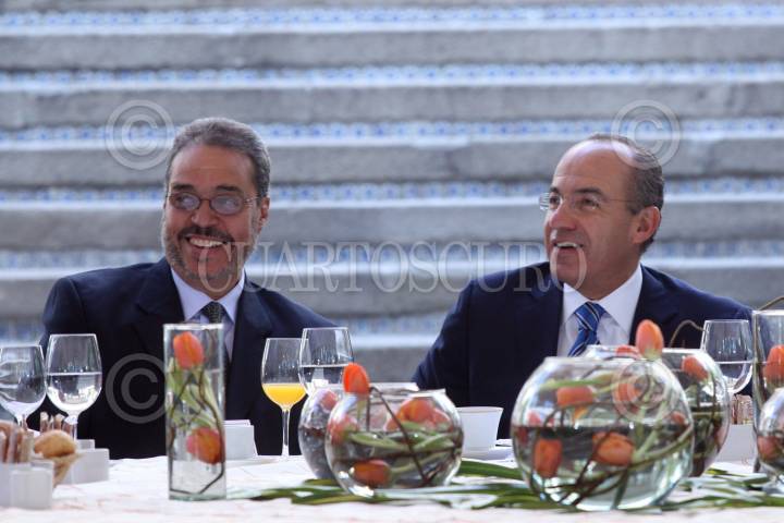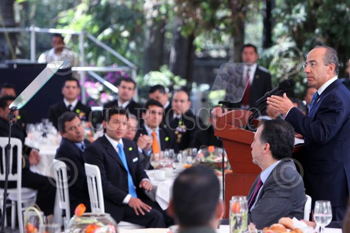 MÉXICO D.F.,05MARZO2010.- Felipe Calderon Hinojosa Presidente de México, durante el desayuno con la misión Mexicana de ayuda humanitaria que viajó a la Repíblica de Haiti el desayuno se realizó en las escalinatas de la explanada de la residencia oficial de los Pinos. FOTO: ARIEL GUTIÉRREZ/CUARTOSCURO.COM
