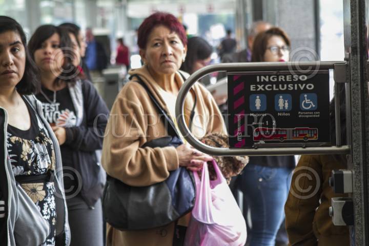 MÉXICO, D.F., 03ENERO2016.- Señalización del ingreso exclusivo de mujeres en Metrobus, el cual marca que mujeres, niños y personas con discapacidad tienen acceso preferencial en las primeras puertas. FOTO: MOISÉS PABLO /CUARTOSCURO.COM
