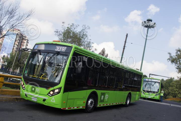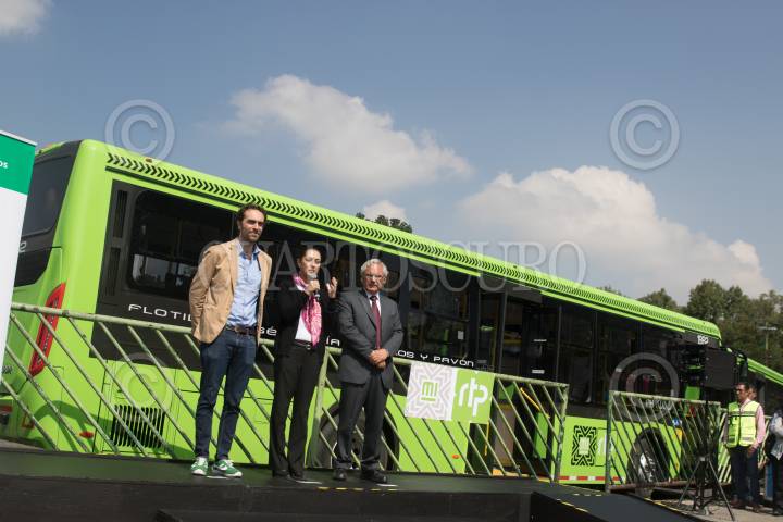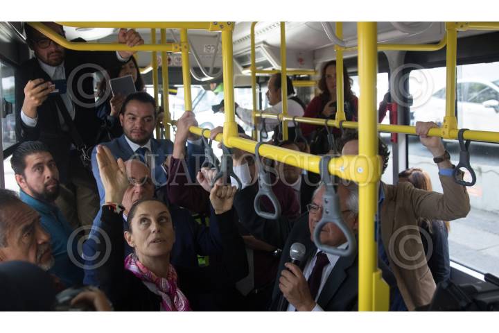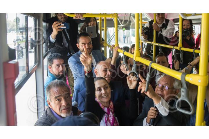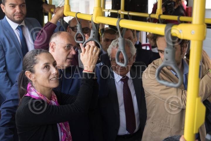 CIUDAD DE MÉXICO, 30JULIO2019.- Claudia Sheinbaum, Jefa de Gobierno; Andrés Lajous, secretario de Movilidad, y Ramón Jiménez López, director del RTP de la Ciudad de México, durante el banderazo de salida de 18 unidades que circularán por el Circuito Bicentenario, estas unidades cuentan con cámara de seguridad, botón de pánico, y rampa para personas en silla de ruedas. FOTO: MOISÉS PABLO /CUARTOSCURO.COM