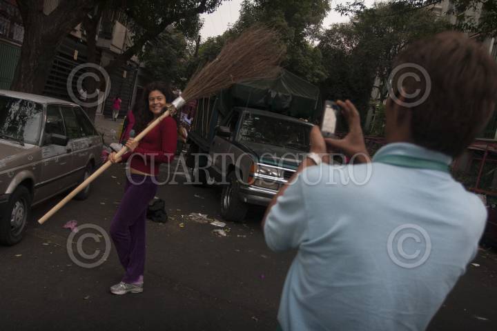 MÉXCICO, D.F., 23ABRIL2013.-En la Colonia Condesa una clienta del tianguis sobre ruedas, que se pone en las calles de Pachuca y Juan de la Barrera los días martes, se toma fotos con las escobas para barrer el pavimento. FOTO: JUAN PABLO ZAMORA /CUARTOSCURO.COM