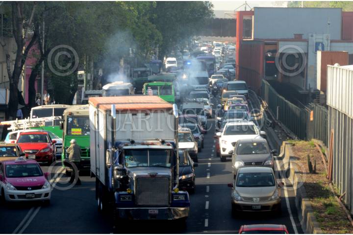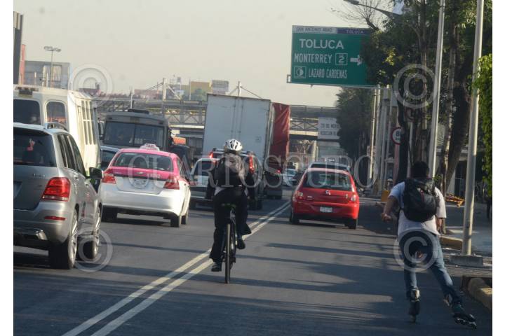 CIUDAD DE MÉXICO, 05ABRIL2016.- A pesar de la aplicación del programa vial "Hoy No Circula", el cual contemplo el día de hoy la restricción de circulación para los coches con engomado rosa y terminación 7 y 8, que implica que no circulen cerca de un millón de vehículos particulares, los capitalino vivieron un intenso tráfico en las llamadas vías primarias. La calidad de aire se reporta como mala. Algunos ciudadanos prefirieron algún transporte alternativo como la bicicleta y los patines. FOTO: ARMANDO MONROY /CUARTOSCURO.COM